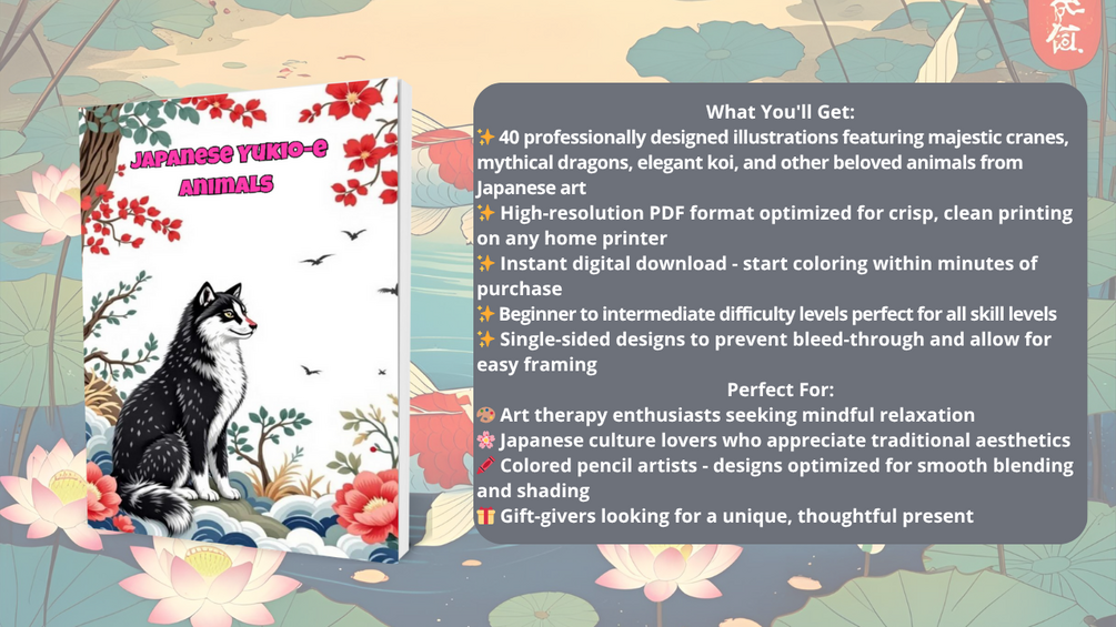 Unlike generic coloring books, each design is carefully crafted to honor authentic Ukiyo-e artistic principles while remaining accessible for modern colorists. The intricate patterns and flowing lines create a meditative coloring experience that transports you to the peaceful world of traditional Japan.